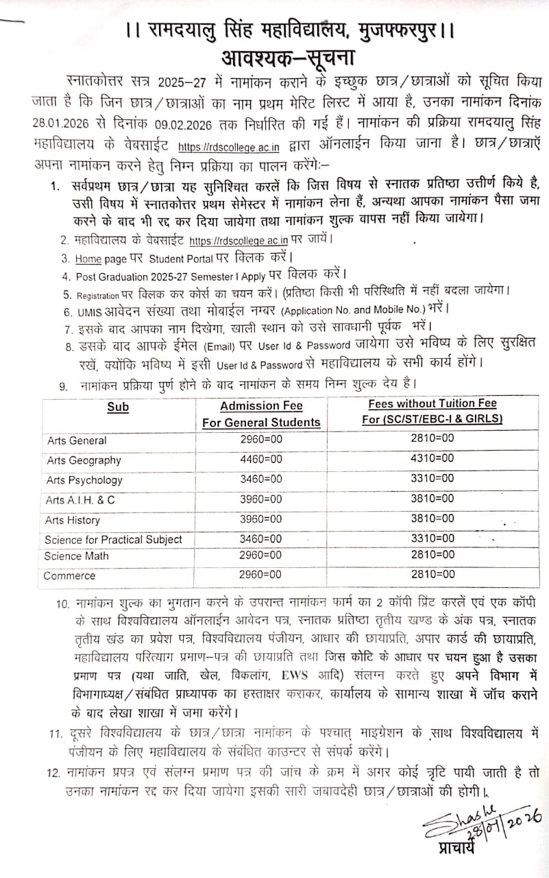 स्नातकोत्तर सत्र 2025-27 में नामांकन के संबंध में