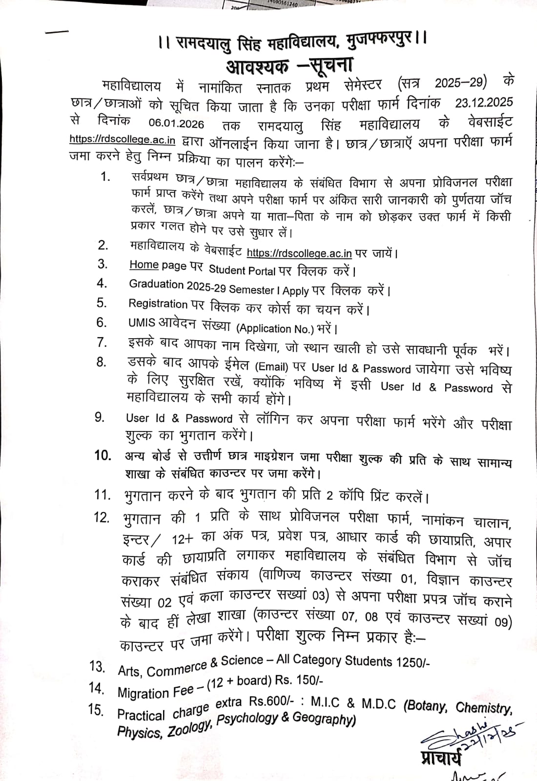 स्नातक प्रथम सेमेस्टर (2025-29) परीक्षा फार्म